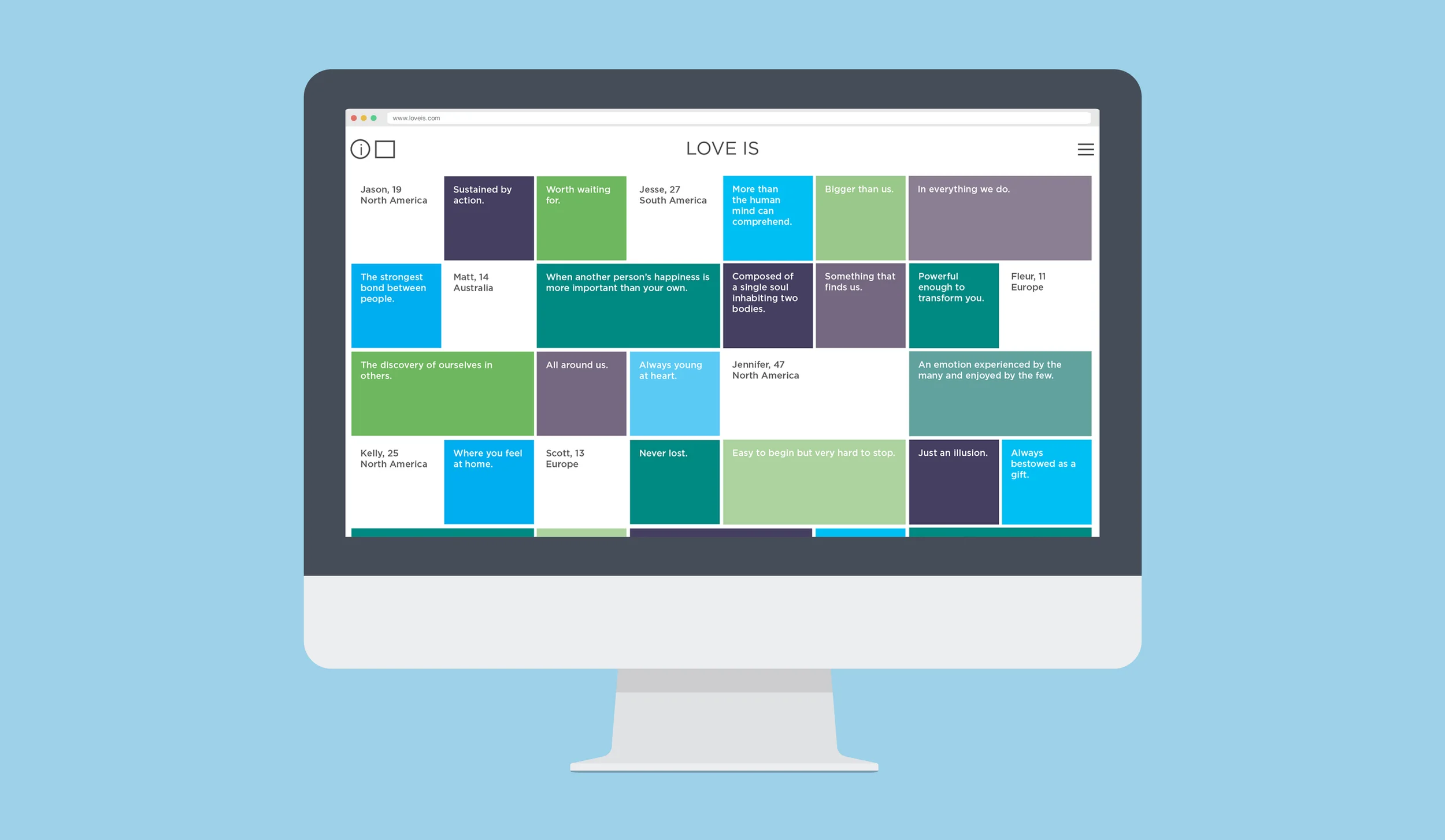 Love is is a website that allows users to submit their definitions of love. Responses can be sorted by age, sex, relationship status and location.